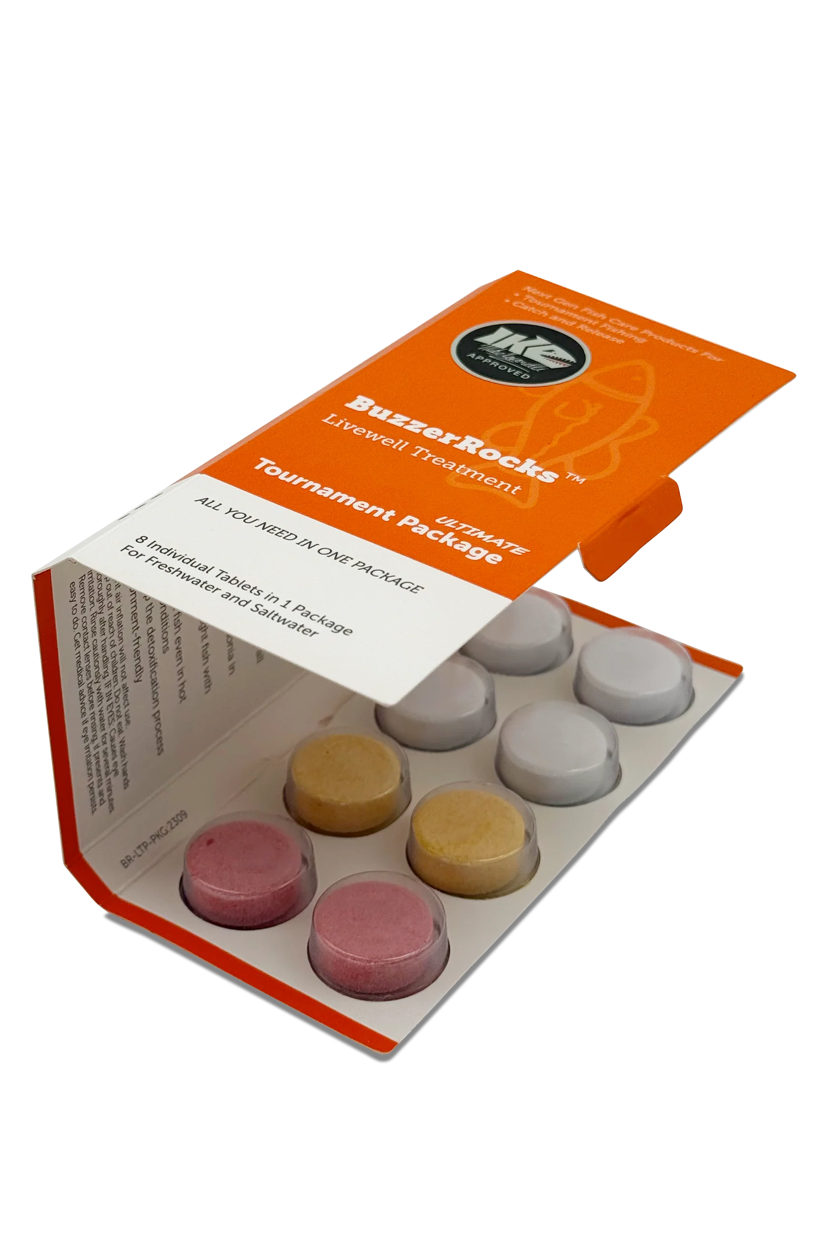 Our Ultimate Tournament Package offers the best fish care solution from all perspectives. The package combo comes with individual tablets that increase the dissolved oxygen in the livewell water, removes nitrate and ammonia, relaxes caught fish, and decreases a fishes stress level caused by drastic movement, water temperature variations, and extreme weather. The package also provides vitamins, micronutrients, and Amino Acids to better sustain the well-being of fish kept in a tank / livewell. This pack provides a one-stop solution for all your fish care concerns.