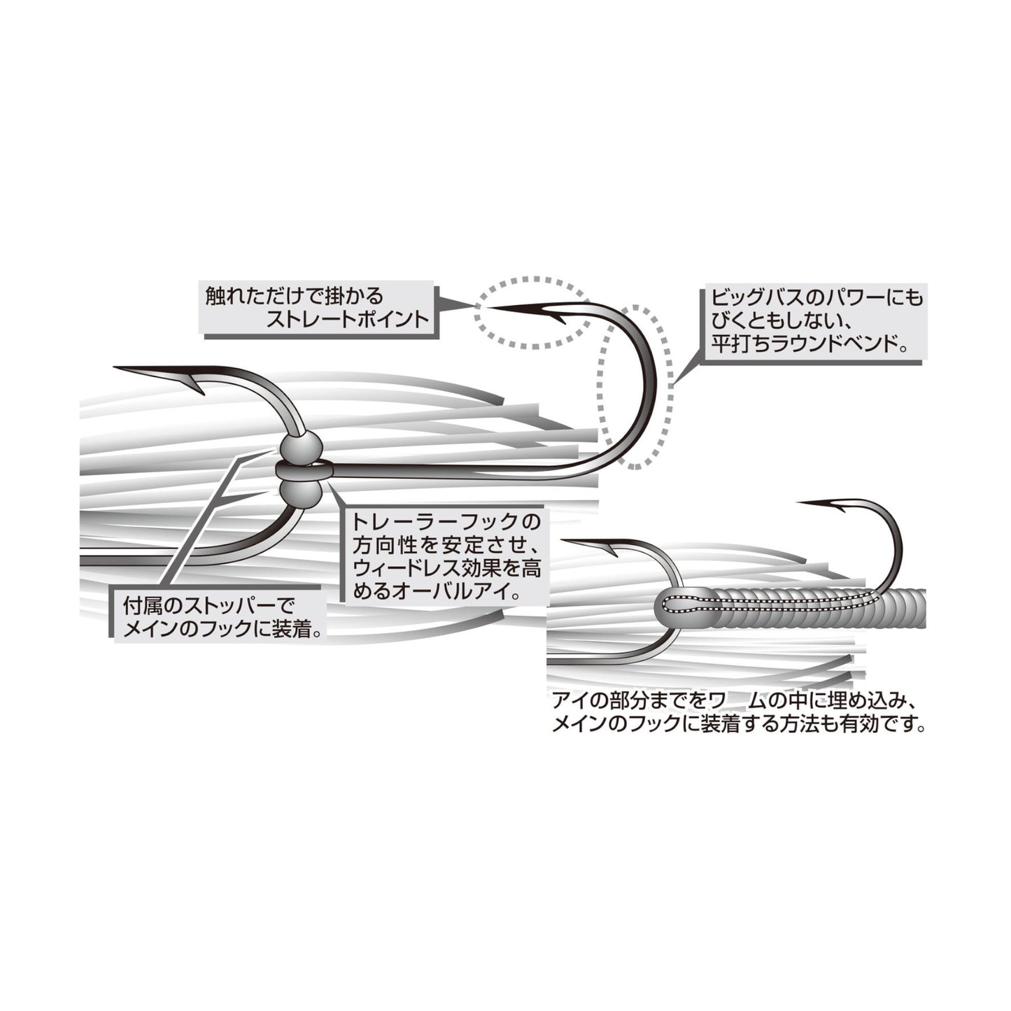 The trailer hook "Chaser" adopts a unique oval eye that has a small tilt angle, stabilizes the directionality of the trailer hook, and improves the weedless effect. On top of that, the straight point catches short bites, and the flat round vents bring big bass to the landing.