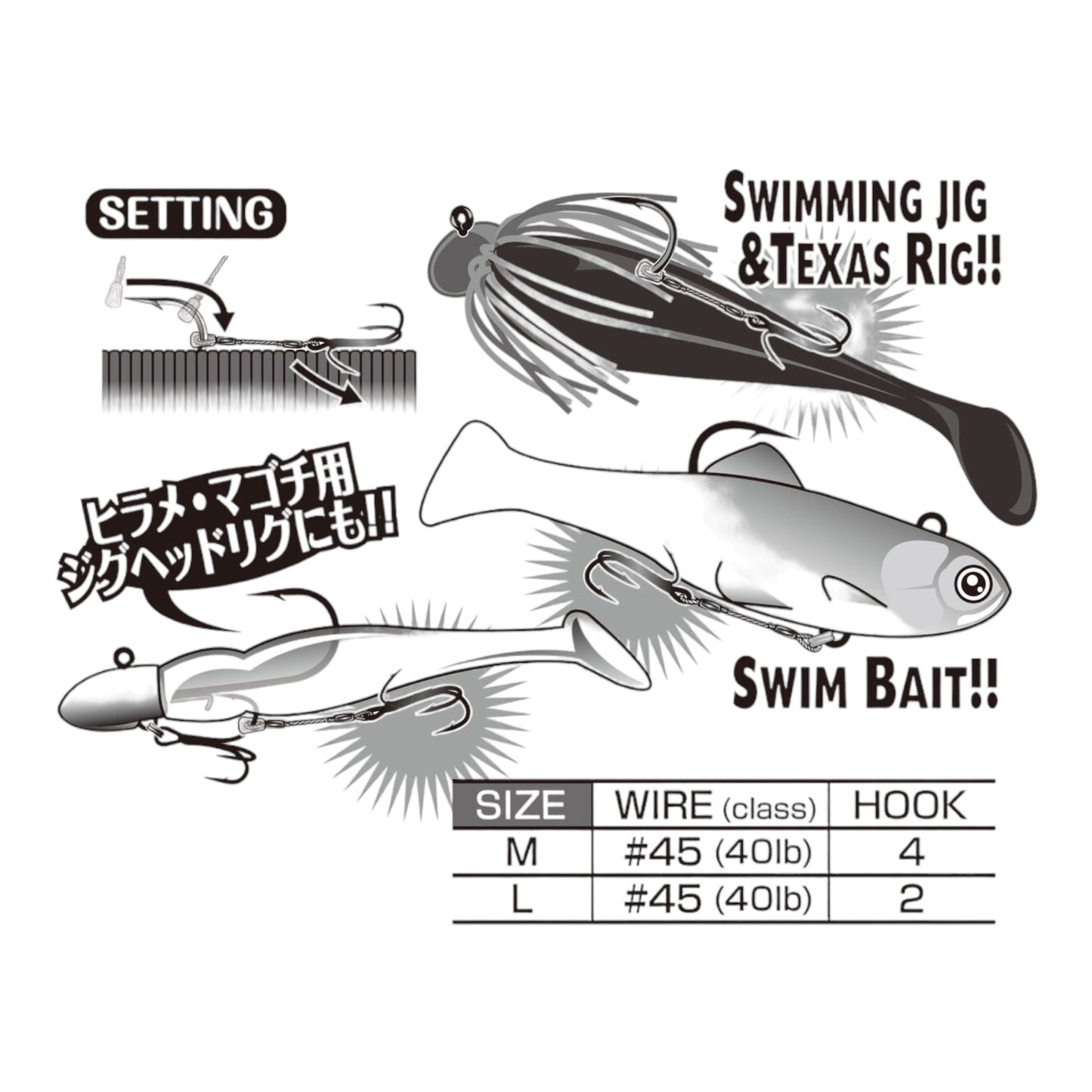 It is an assist system that increases the hooking rate by attaching it to a swimbait that is difficult to hook in the normal state. Extend the double hook with bait holder with a wire. After hooking, the hook is removed from the worm, and even if the fish rampages, the wire flexibly follows it, making it difficult for the bait to fall apart. It is also possible to attach it to the rear eye of the jig head with a split ring.