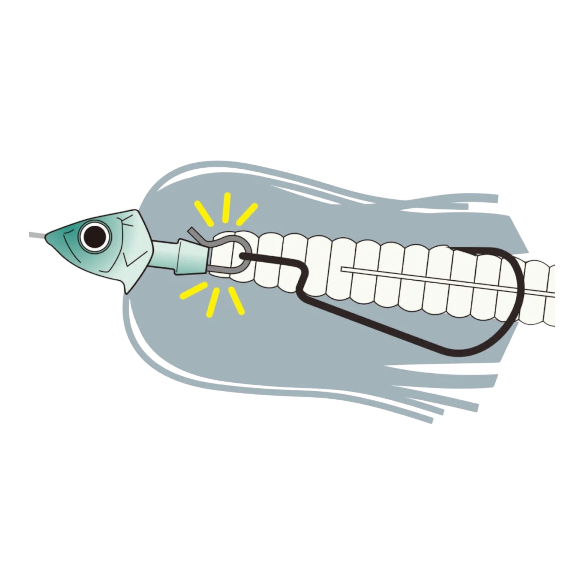 The soft plastic trailer can be secured on the hook that is secured by the hook hanger clip, which keeps the hook semi-fixed to prevent the trailer from sagging and impacting your hookup percentage. The hook placement also prevents the bass from shaking free during the fight.