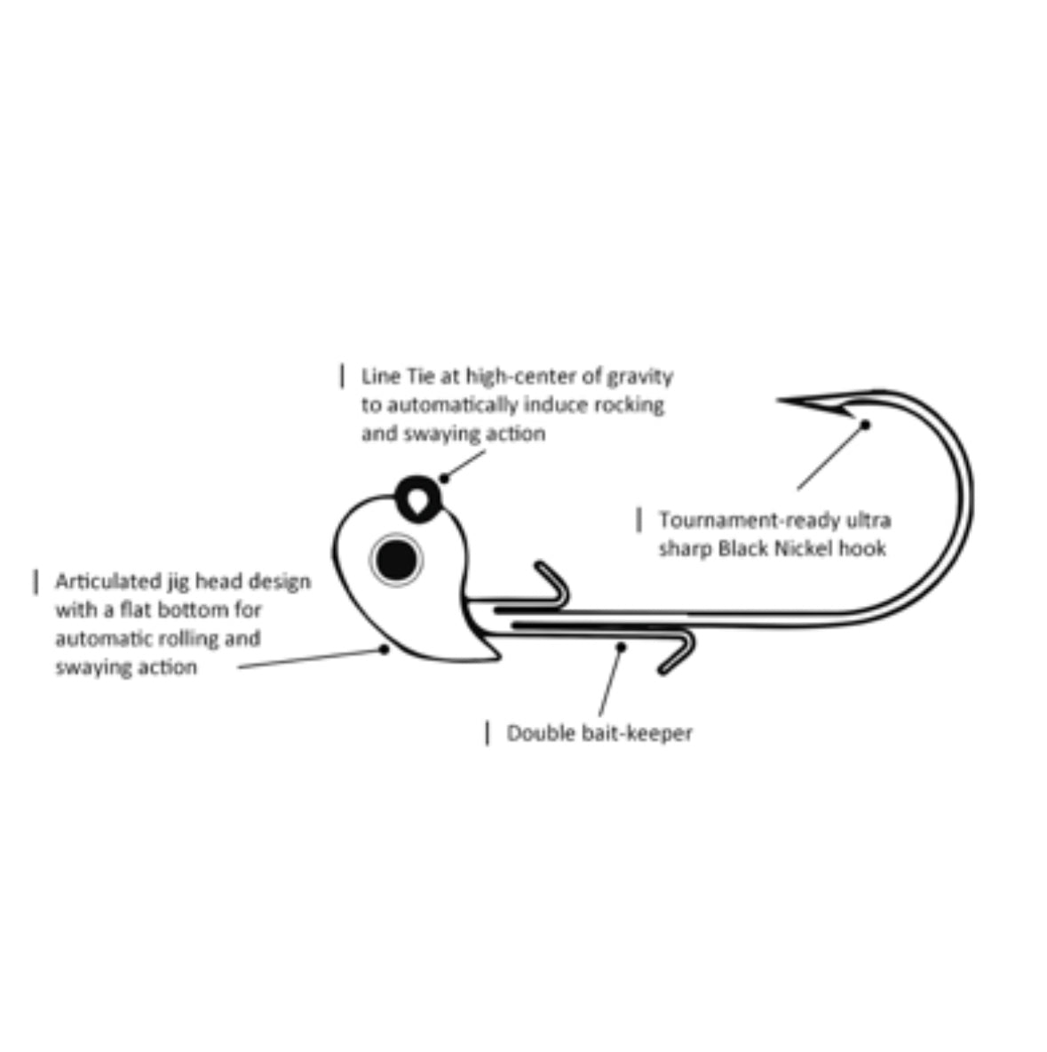 Designed in collaboration with Major League Fishing pro, Jacob Wall, the Duckett Baits Sway Jighead pairs perfectly with the Duckett Baits Sway Minnow and features an articulated flat bottom head design with a high center of gravity line tie that creates automatic rolling and swaying action.