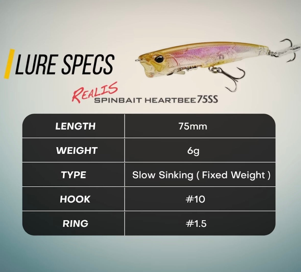The Duo Realis Heartbee 75SS is a slow sinking spinbait with a wide mouth design that draws in water causing propellers to rotate creating an ideal amount of water resistance which produces a unique undertow and squeaky metallic sound.