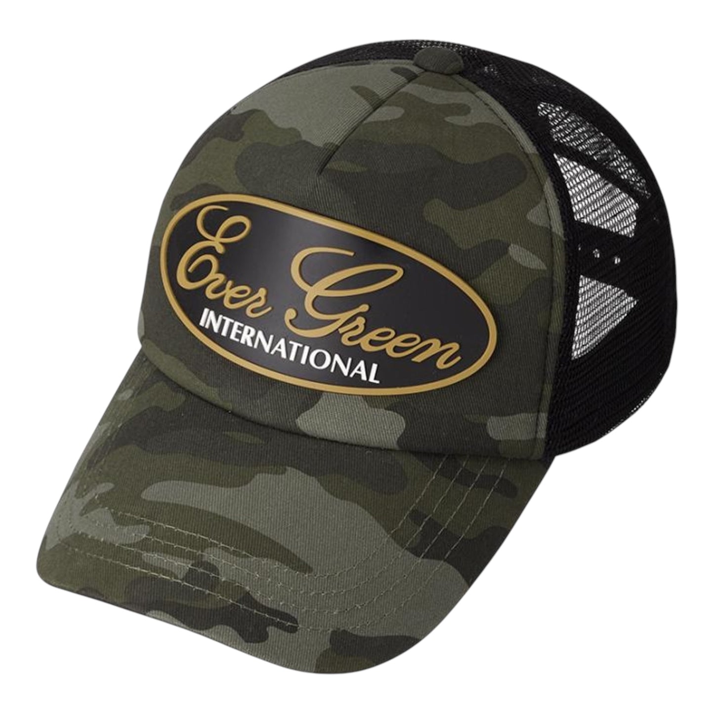 Camouflage front and black mesh back Evergreen International snapback hat.