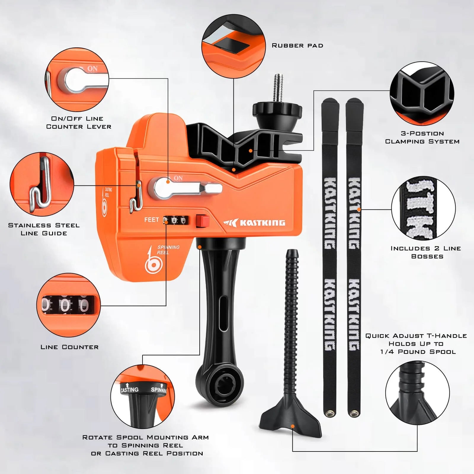 Perfect for spooling both spinning and casting reels without introducing twist, the KastKing Kalibrate Line Spooler Line Counter features a 3-position clamping system to fit nearly any size rod with tension bands that apply the ideal amount of pressure during the spooling process. The patent-pending design features a built-in line counter that tracks exactly how much line you are adding to the reel, so you can evenly split a spool of line between two without coming up short on the second reel.