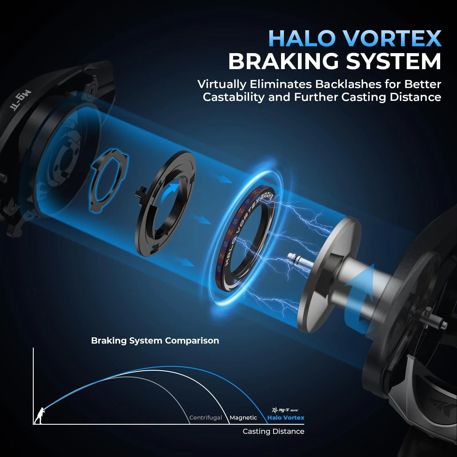 The KastKing Mg-Ti Elite Baitcasting Reel is equipped with the Halo Vortex Braking System, featuring a seamless ring of 12 NS magnets for smooth, stable casting. The self-adaptive magnetic braking provides strong control during high-speed casts, reducing braking force as the cast progresses to optimize distance. Its cross-threaded design minimizes brake weight, offering a more stable and efficient casting experience without added spool load.