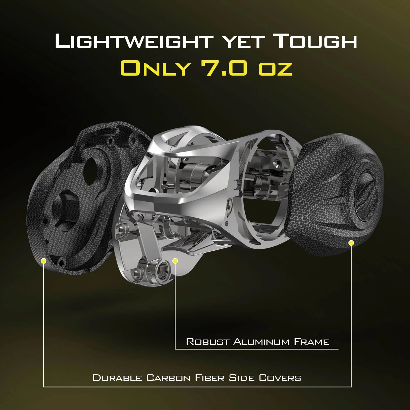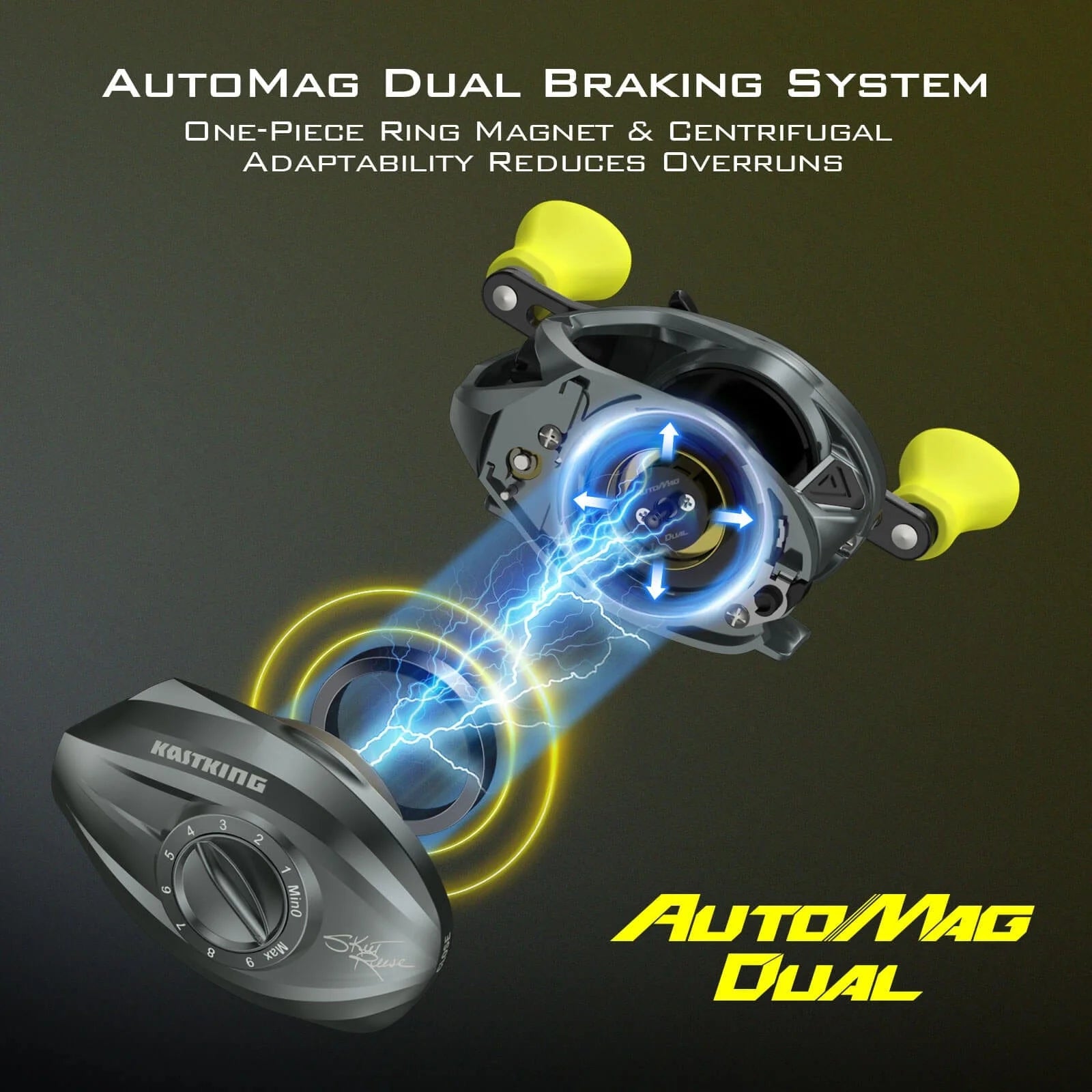 Proudly endorsed by the world-renowned professional bass angler, Skeet Reese, the KastKing Skeet Reese Icon Casting Reel is the pinnacle of featherlight performance coming in at 7oz. It’s robust aluminum frame and durable carbon fiber side plates provide remarkable strength, ensuring longevity without sacrificing mobility. The Automag Dual Braking System is a game-changer, significantly improving casting distance while minimizing frustrating overruns.