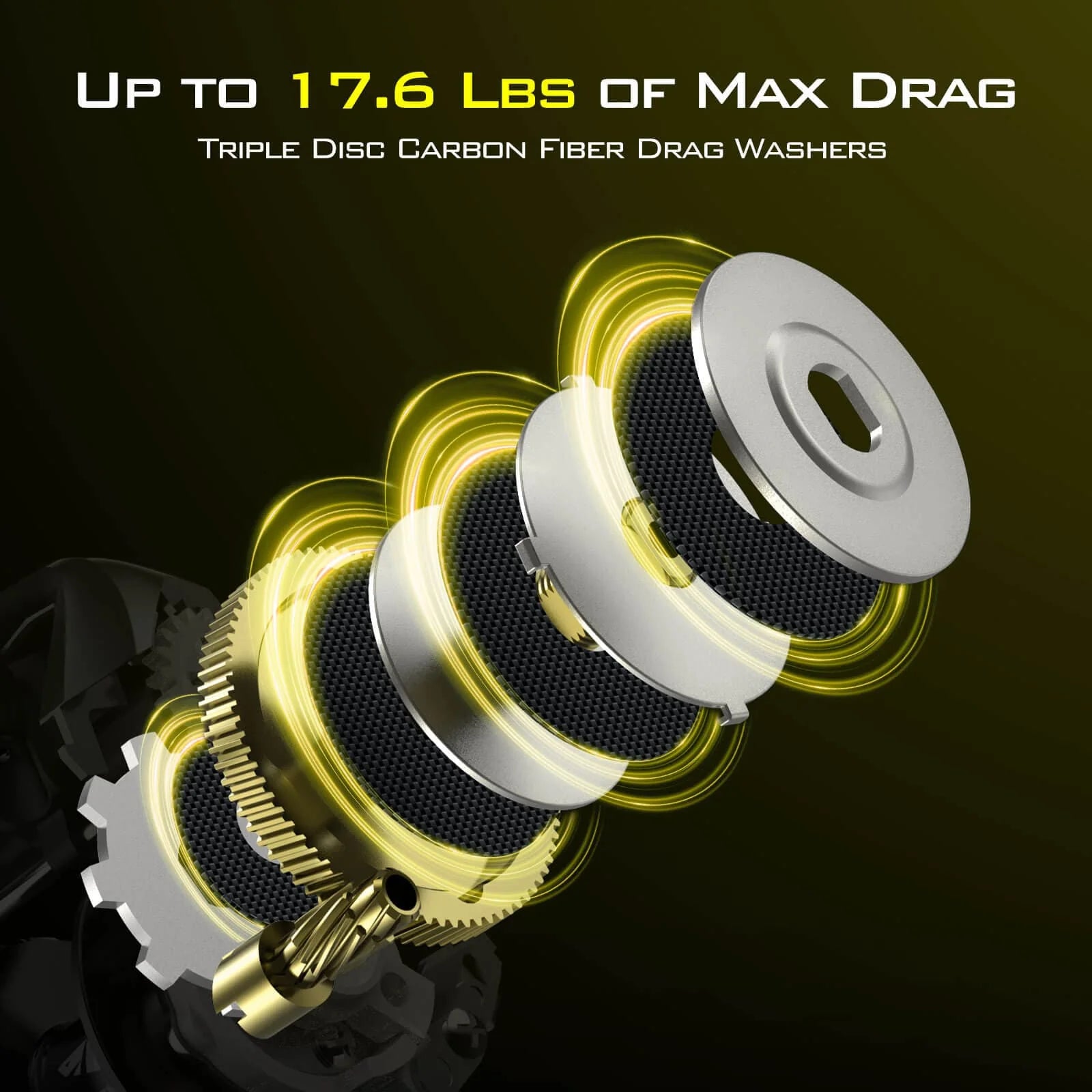 When it comes to stopping power, the Skeet Reese Icon doesn't disappoint, thanks to its Triple Disc Carbon Fiber Drag Washers, capable of delivering up to 17.6 pounds of maximum drag. The double-bearing supported pinion gear ensures smooth operation even under heavy loads. Added premium features like TPE handle knobs for comfort and control and the patented Low Friction Tapered Vortex line guide for greater casting distance make this reel a must-have for serious anglers. Elevate your fishing experience and reel in your next trophy catch with the KastKing Skeet Reese Icon Casting Reel.