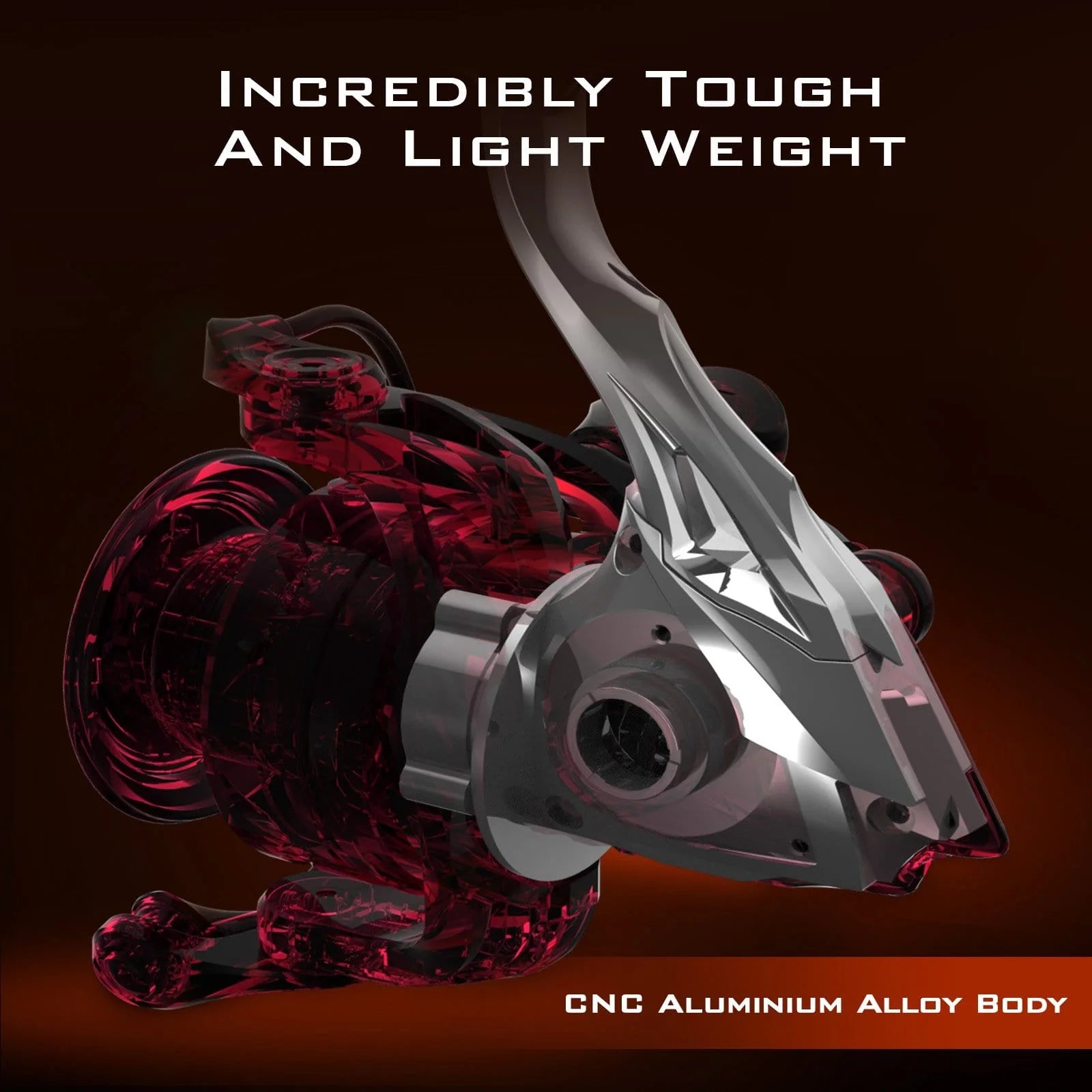 A KastKing Speed Demon Elite spinning fishing reel has a high-strength CNC machined aluminum alloy body and body covers to virtually eliminate frame twist. KastKing takes weight reduction a step further with a 7075 aluminum main gear, carbon fiber rotor and CNC aluminum handle with EVA handle knob. Size 2000 weighs only 8.7 ounces and size 3000 is a mere 8.9 ounces, even lighter than graphite reels. Less weight means less fatigue on long fishing trips.