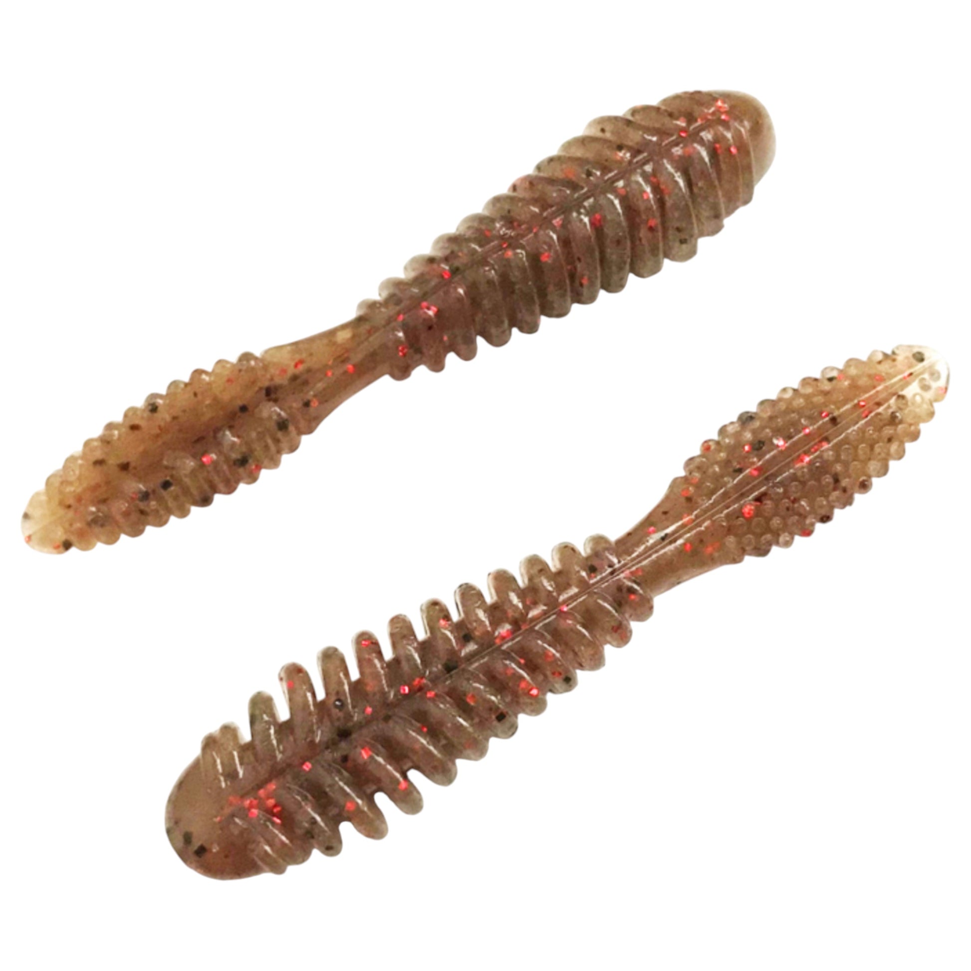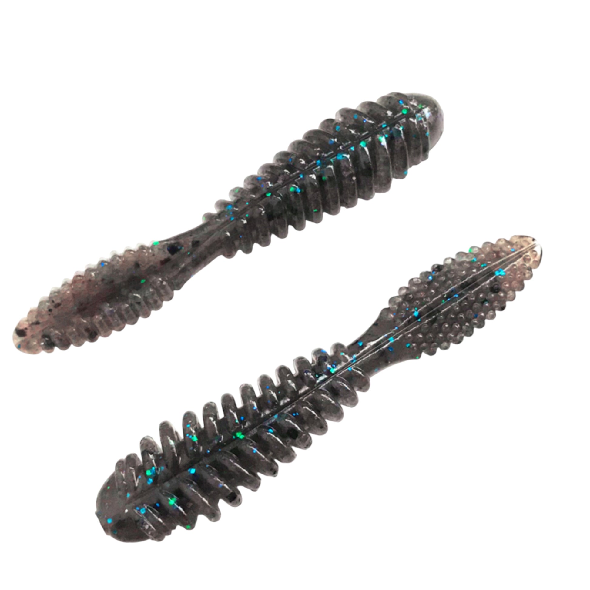 The distinctive ribbed body and large goby tail are designed to create a "slow and fast" movement. Its outstanding bite into the water makes it stand out. And when it suddenly stops, the distinctive flapping of its tail draws in bites. It can be used as a trailer for small rubber jigs, and is highly adaptable for a wide range of uses. It uses a high-density material with a trusted shrimp and baitfish flavor. Its outstanding presence makes it stand out.
