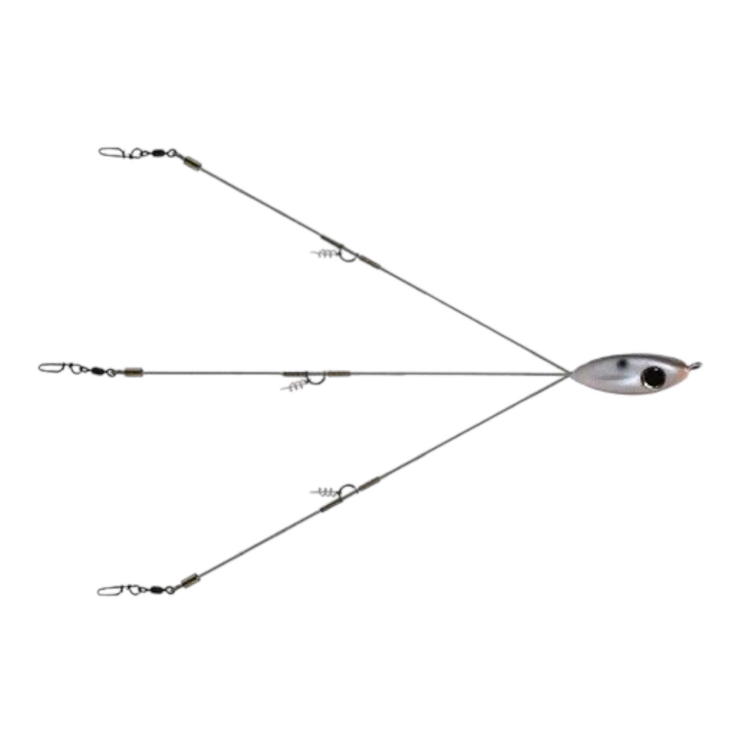 Equipped with industrial strength spring wire, 75 pound test strength snap swivels and a 90 pound test imbedded nose swivel.