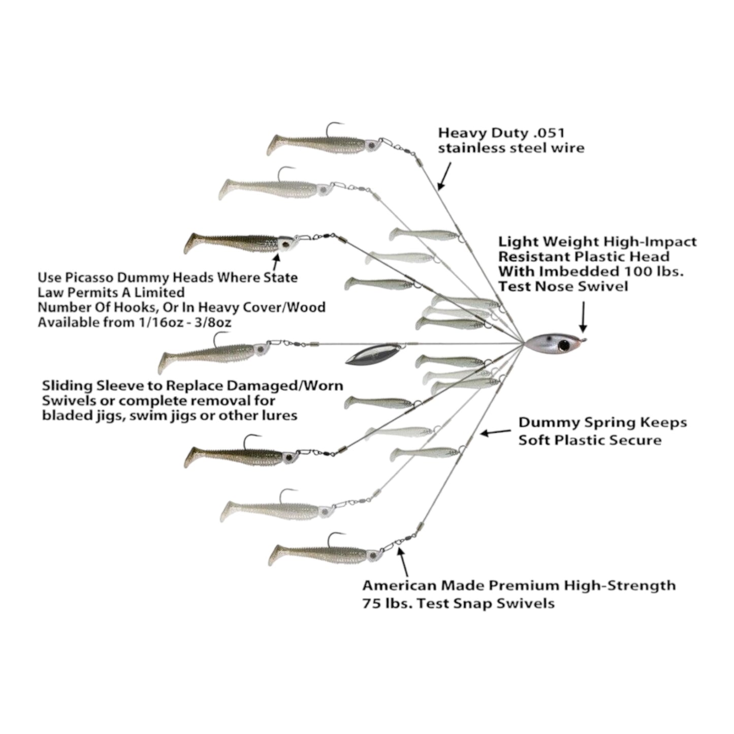 The rigs terminal snap swivels can be rigged with hook or Dummy heads and feature a slide-up sleeve to quickly change them out from a swivel to a Picasso Dummy head or just a bait-keeper spring.